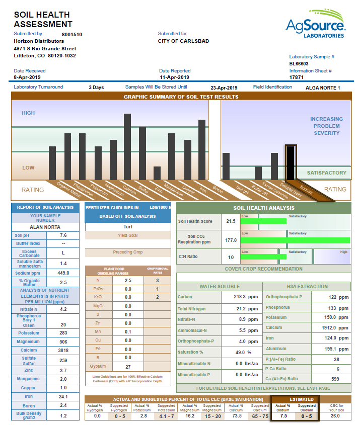 Take a look at these soil and irrigation suitability tests, both from a non-potable irrigation source. You can see that the soil test is reflective of the liabilities of the water – in this case excessive salts.